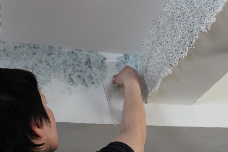 Для нанесения на потолок стоит использовать стремянку или стол, чтобы удобно расположиться. Шпатель лучше использовать прямоугольный средней величины. Разравнивать смесь лучше круговыми движениями. Если волокна более длинные, их нужно немного дольше протягивать.