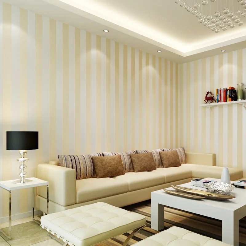 Для гостиной хорошей цветовой гаммой будет сочетание желтого и красного. Если в комнате есть несколько больших окон, солнечные лучи могут усилить светло-желтые и розовые полосатые обои.