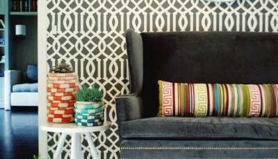 - Полосы с вертикально расположенным орнаментом разного дизайна. Более узкая полоса вытянет стену вверх. Часто такой подход используется вокруг окна, дивана и т. п.