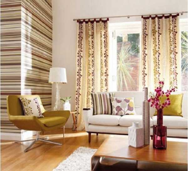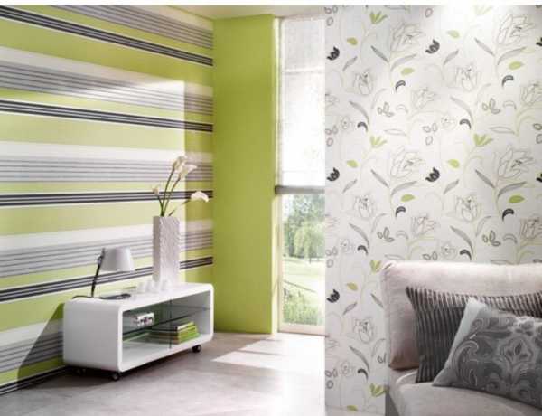 Оформление зала в вертикальном и горизонтальном сочетании допускает выбор ярких и спокойных оттенков обоев.