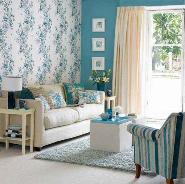 - Для маленькой зальной комнаты подходят светлые тона, допустим мелкий принт. Крупные элементы визуально уменьшат пространство.