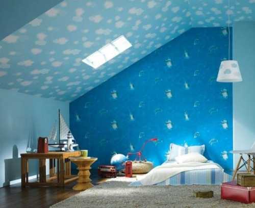Если в комнате у ребят невысокие потолки то, применив обои с вертикальными полосами, вы зрительно увеличите их. И в этом варианте потолок нужно делать немного посветлее стен. При высоких потолках в помещении нужно клеить обои с расположенными горизонтально полосками. Такие приемы дают возможность оформить жилище детей более уютно.