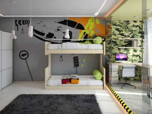 Сыновья подрастают, и на становление личности уже влияют их осмысленные интересы. Например, подросток увлекается гоночными машинами и всем, что связано именно с этой темой. В таком случае ремонт стен в его комнате можно сделать с применением фотообоев, на которых изображены гоночные сцены или автомобили. Жизнерадостное настроение задают обои с морской тематикой или путешествиями. Самим подросткам свойственно увлекаться граффити, поэтому родители могут наклеить обои в таком стиле.
