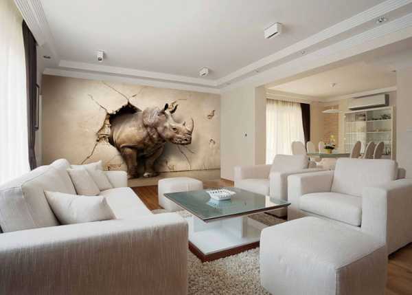 На фото гостиная и стена с 3д фотообоями с носорогом.