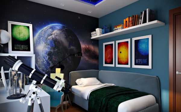 На фото комната подростка и стена с космическими 3д фотообоями.