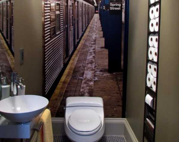 На фото ванная комната и 3д фотообои с изображением тоннеля.