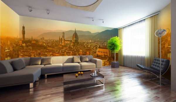 Фотообои в гостинойВ небольшую гостиную можно подобрать 3д фотообои в светлых тонах с перспективным изображением. Для помещения более внушительных размеров выбирают темные цвета и необычные объемные рисунки. Главное, чтобы полотна сочетались с общей тематикой интерьера зала.
