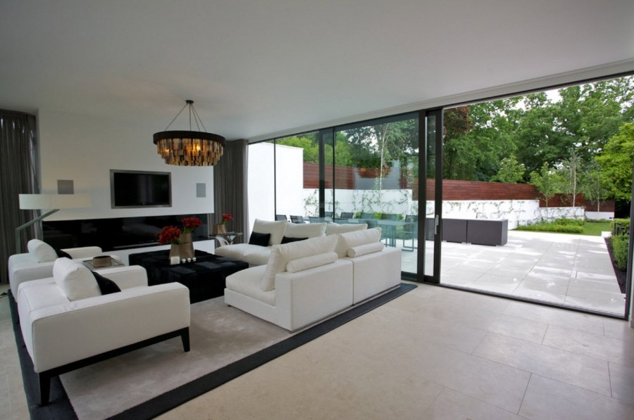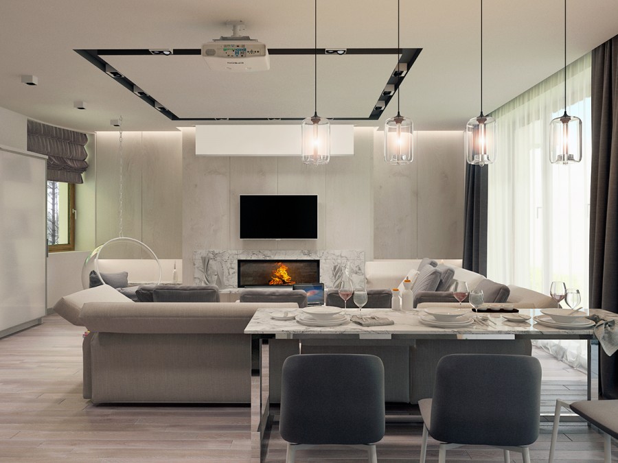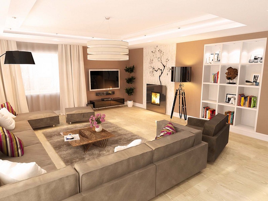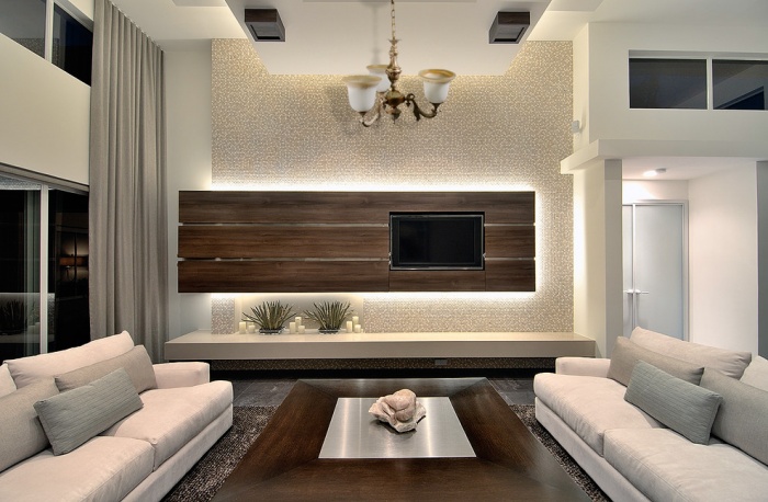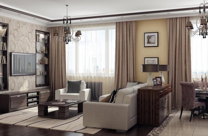 В гостиной обои должны притягивать восхищенные взоры гостей. Распространенным вариантом для зала на сегодняшний день являются обои разных цветов, но одного оттенка. Данный прием позволит вам разделить зал на несколько зон: рабочую, столовую и для отдыха.