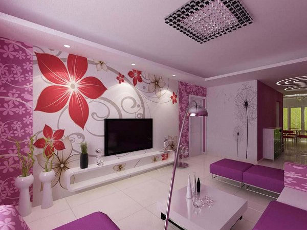 - Для большой комнаты обои могут быть ярких цветов с крупным рисунком. Данный выбор цвета сделает комнату более торжественной.