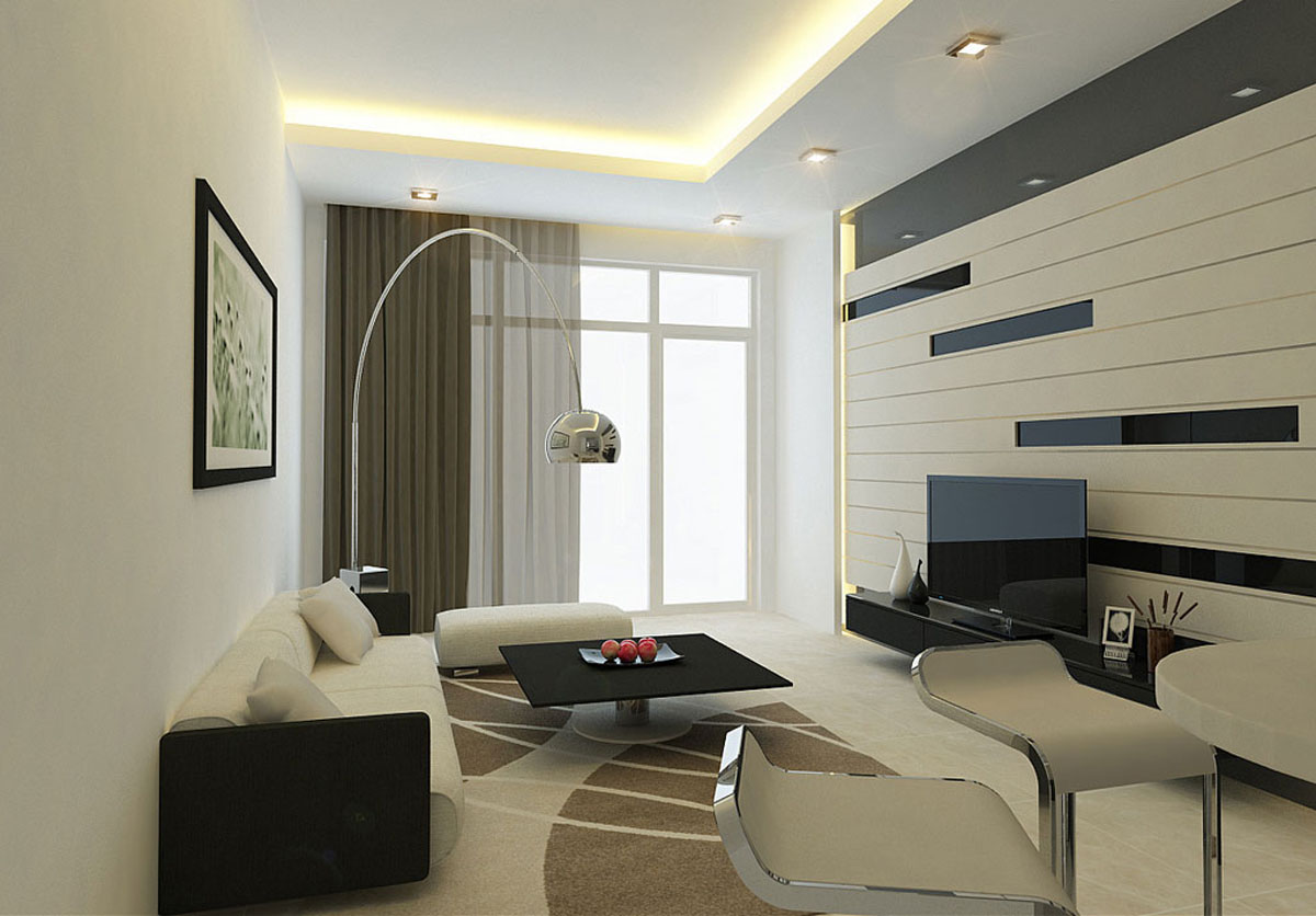 Оформление потолка влияет на восприятие всей комнаты. При небольшой высоте стен гостиной придется отказаться от сложных многоуровневых конструкций и темных цветов.