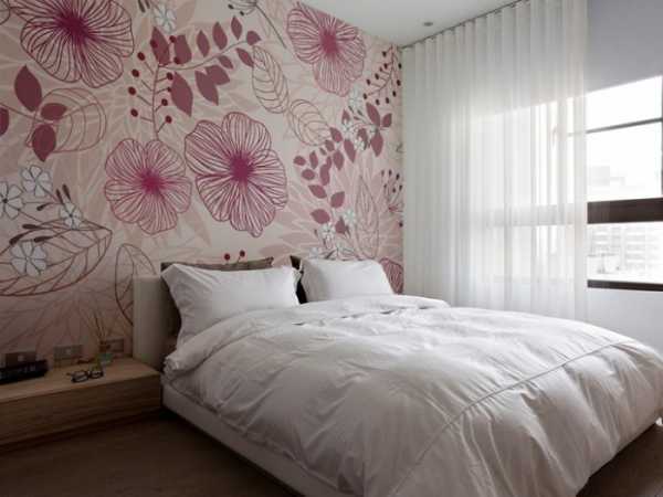 В изголовье кровати можно поместить небольшое панно с цветком в нежных тонах. Варианты оформления целой стены цветочными обоями создадут уютную атмосферу в комнатк. Букет цветов или россыпь лепестков в нежных тонах лучше использовать для пустой стены напротив кровати.