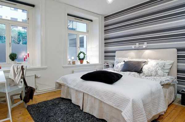 Можно сделать полосатой не дону стену, но часто их чередовать не стоит — одна-две на поверхности. Важно только правильно подобрать место. Например, если спальня длинная и узкая. Короткую стену оклеиваете более яркими обоями и отступив от угла некоторое расстояние размещаете еще полосу на длинной поверхности. Визуально короткая будет казаться ближе и шире.