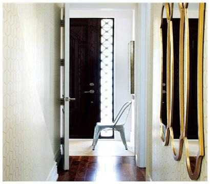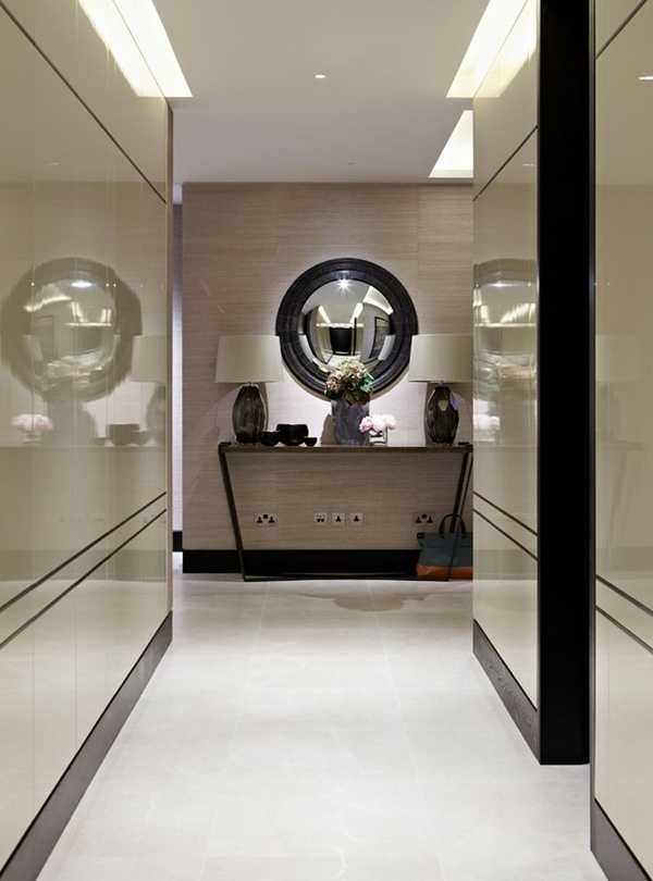 Обычные двери между прихожей и гостиной или кухней можно заменить декоративными занавесками.Красивая портьера с драпировкой может разделить помещение на две части: прихожую и проходную. В целях экономии места распашные двери удобно заменить раздвижными конструкциями. Выгодно подчеркнет дизайн узкого коридора дверь, в которой вместо стеклянных вставок вмонтированы зеркала.