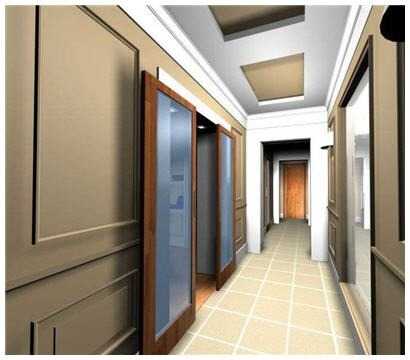 Вообще, узкие коридоры — это отдельный разговор. При помощи некоторых уловок можно добиться эффекта расширения пространства. Например, при достаточной высоте потолков, в узком коридоре примерно посередине стены можно сделать полосу другого цвета. Этот прием позволяет «развалить» стены в стороны. Эффект увеличивается, если на противоположной стене есть большое зеркало или зеркальные дверцы шкафа.