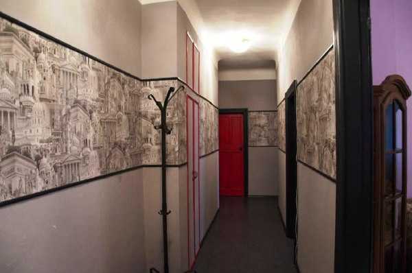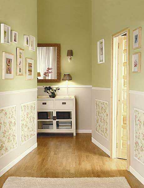В последнее время особенно популярным стало оформление стен в проходном помещении комбинированными обоями с молдингом, который скрывает стык материалов. При этом нижнюю часть стен следует сделать несколько темнее, чем верхнюю. Надо помнить, что контраст между тоном обоев-компаньонов должен быть минимальным. Лучше всего смотрится комбинация оттенков «кофе с молоком/молоко». Цвет молдинга может совпадать с тоном дверных наличников либо он может быть чисто белым.
