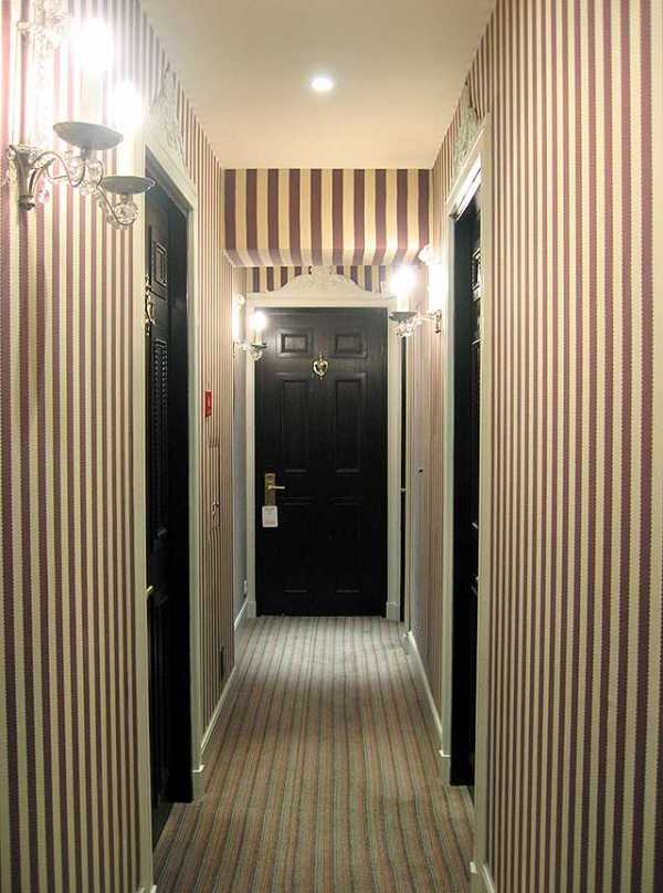 Можно использовать в узком коридоре обои в полоску. Но искать нужно широкие полосы. Узкие создадут эффект пестроты. Если такие не найдены, можно скомбинировать два цвета одного типа (о таблицах сочетаемости цветов в интерьере читаем тут). Если потолки высокие, можно располагать полосы горизонтально, если нет — вертикально.