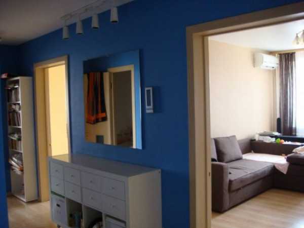 Прихожая с отделкой коричневыми обоями— синий цвет – холодный, поэтому действует успокаивающе, снимает усталость и создаёт ощущение тепла и уюта, в особенности в комбинации с жёлтыми и оранжевыми оттенками.
