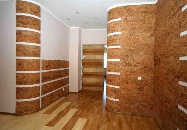 - В-четвертых, пробковые обои в коридор. Покрытые специальным лаком, они хорошо поддаются мытью, являются экологическими, приятны своей натуральностью. Они наполняют помещение особенным теплом, подобно дереву. Особенно хороши они, если применяются в комбинации с другими типами отделки стен коридора. Выбор цветовой гаммы их не очень велик. Они больше подходят для коридоров светлых и достаточно просторных.