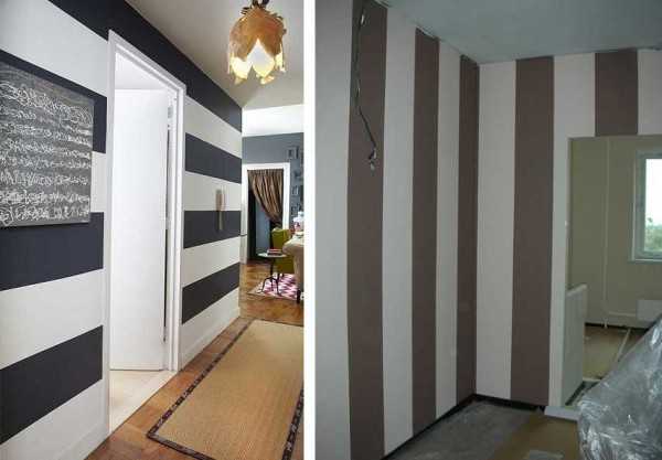 Чтобы не перегружать чередованием цвета небольшое пространство, полосы располагают фрагментами, остальное заклеить однотонными обоями. Это, кстати, один из приемов комбинирования в интерьере.
