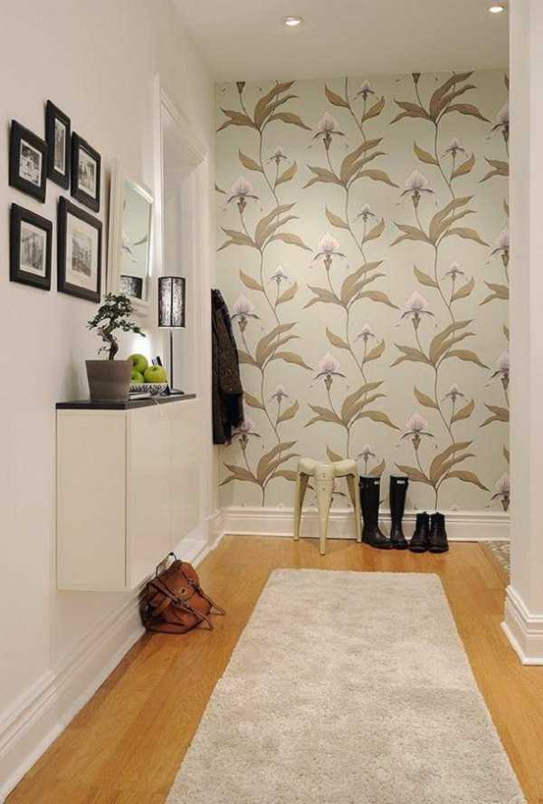 В длинных узких прихожих можно создать очень интересный эффект, если оклеить помещение разными обоями.