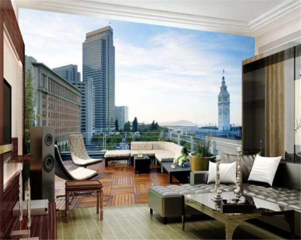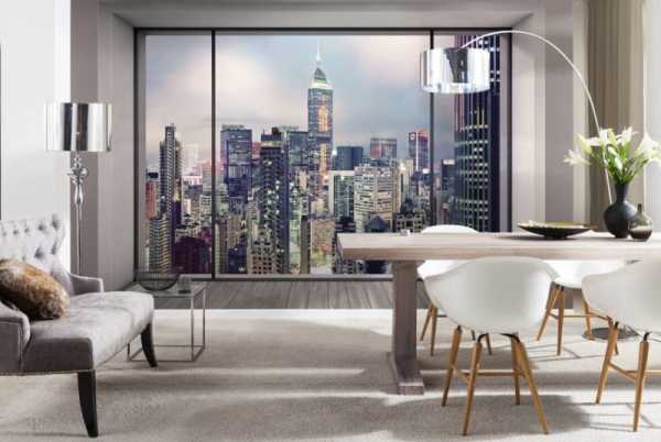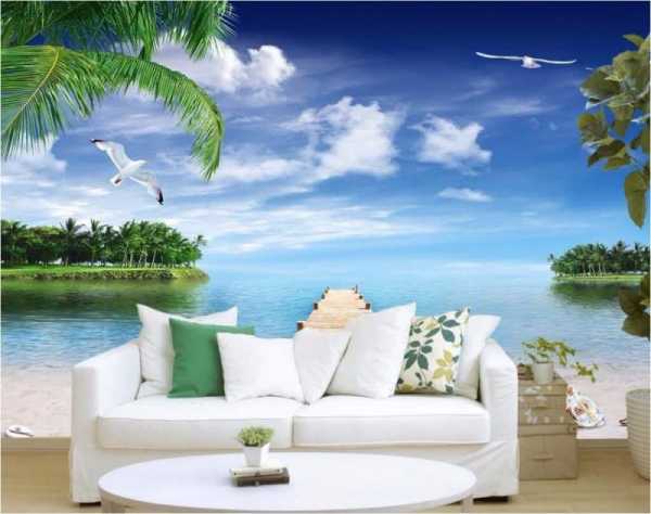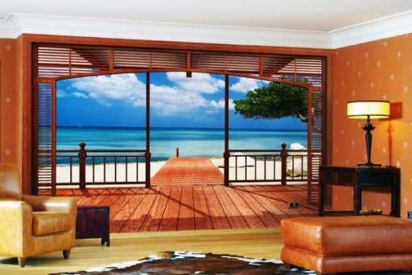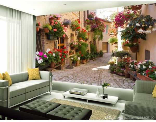 В гостиную отлично впишутся обои 3д с изображением Парижа, Нью-Йорка, Лондона и других городов, небольших улочек и старинных двориков, симпатично будет смотреться и терраса с видом на море.