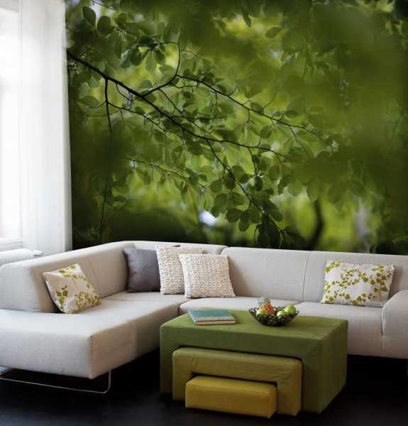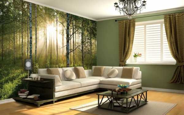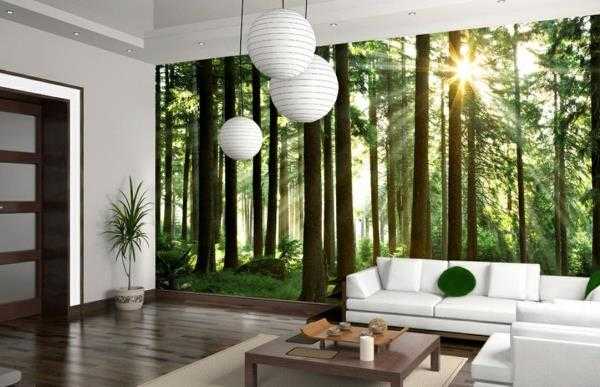 Счастливые владельцы больших гостиных могут разместить в них панорамное изображение во всю стену с одним из таких мотивов: стилизация под старину, рыцарский турнир или замок, имитация книжного шкафа. Все это актуально для гостиной, выдержанной в классическом стиле. Для современного интерьера подойдут виды на природу.