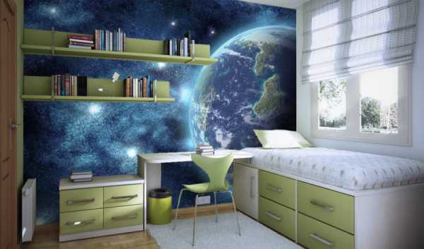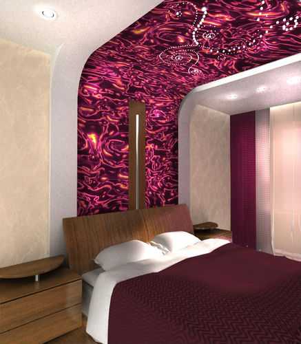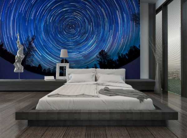 Отличный вариант оформления спальни – потолочные обои, повторяющие рисунок звездного неба, северное сияние или вид космических просторов. Более молодежным вариантом могут стать огни ночного города.