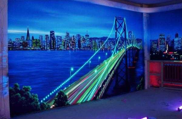 - Флуоресцентные. Такая обработка удивляет своим разнообразием. При дневном свете данные обои будут выглядеть как простые изображения формата 3D. Ну а когда начнет смеркаться, комната будет приобретать совершенно новый внешний вид благодаря тому, что изображения на стенах начнет излучать мягкий свет. Главное для такой обработки грамотно организовать в помещении освещение с помощью люминесцентных ламп;