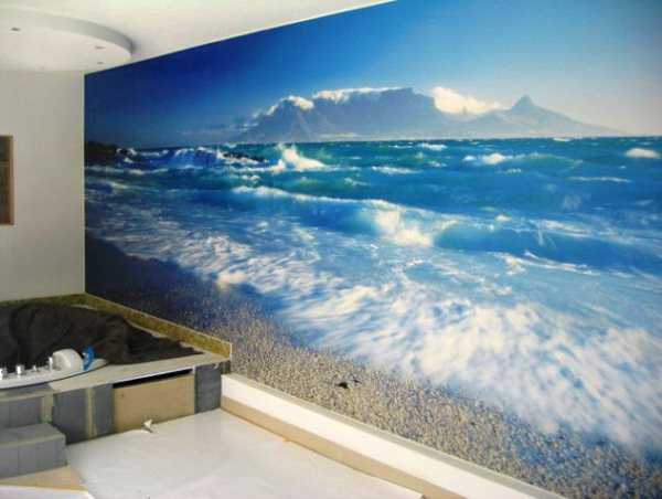 - Стандартные 3 д обои для стен имеют типовой размер. Они покрывают стены полностью. Стандартные фотообои 3д в интерьере на фото имеют изображение морских волн, звездного неба или другие абстрактные рисунки, которые помогают в зрительном расширении пространства помещения.