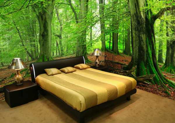 В спальню необходимо подбирать такие отделочные материалы для стен, которые бы способствовали созданию спокойной и гармоничной обстановки. Поэтому при желании приобрести для комнаты отдыха обои с объемным эффектом, выбирайте изображения с пляжем, лесом, красивым парком.