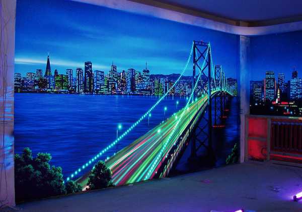 - Флуоресцентные. Большие фотообои на стену, фото которых — сочетание панорамных изображений с подсветкой, которые меняются от изменения освещения. Днем фотообои с 3d эффектом выглядят как обыкновенные пейзажные изображения, а с наступлением вечера начинают излучать неоновый свет, который выделяется по контуру деталей рисунка. Все это дает использование люминесцентных ламп и святящегося порошка.