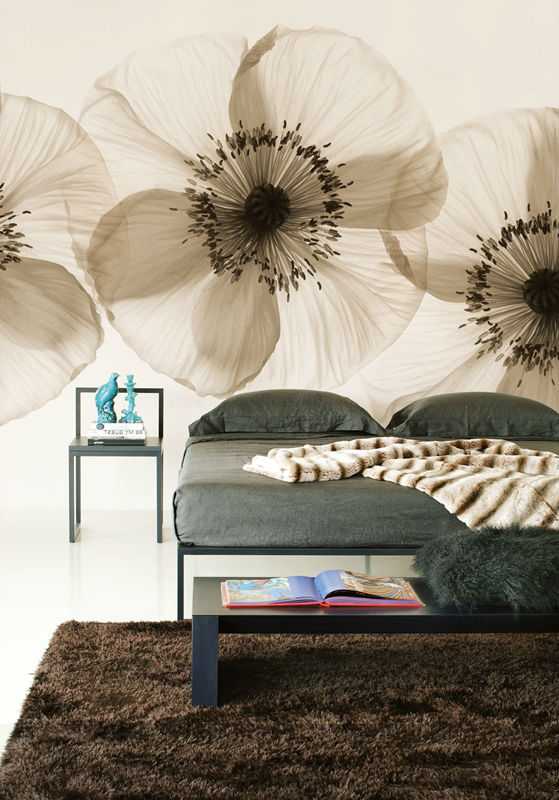 В спальне лучше всего будут выглядеть на стене фотообои 3д в виде одиночных цветов или нежных букетов. Это сделает комнату уютной и пригодной для отдыха.