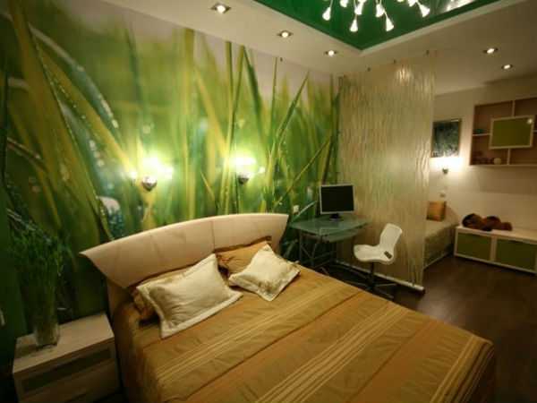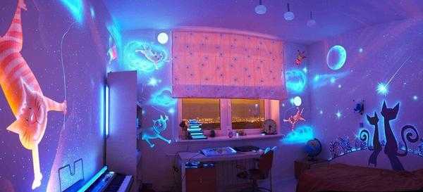 Как показано на фото, очень удачным вариантом оформления спальни и детской могут стать флуоресцентные обои на стены, которые буквально «оживают» с наступлением ночи в свете специальных ламп.