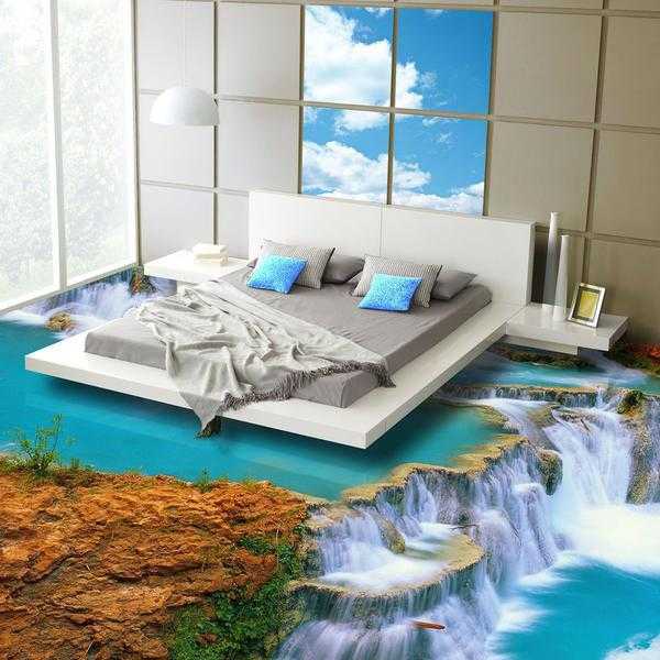 Например, в кухне можно использовать объемные рисунки для оформления стенок между тумбочками и полками в рабочей зоне кухни. В комнате с весьма скромными размерами, с помощью объемных материалов можно добиться визуального расширения пространства. К тому же в интерьер при использовании объемных материалов, можно добиться зонирования помещения. На фото представлен вариант декорирования в интерьере спальни.
