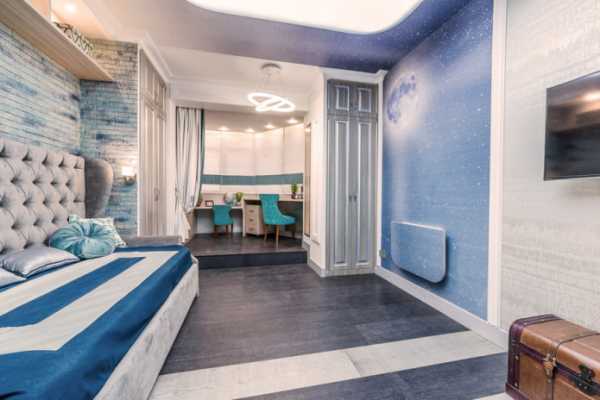 - Голубой. Этот цвет является представителем так называемой «холодной» палитры. Именно по этой причине оптимальным решением станет его использование с тех помещениях, окна которых хотя бы частично «смотрят» на юг. С другой стороны, к положительным оттенкам этой гаммы цветов можно отнести то, что они являются достаточно нейтральными и умиротворяющими. Они не являются агрессивными для восприятия человеческим глазом, а также создают в целом нейтральную и позитивную обстановку. Удачно сочетаются с мебелью и предметами декора.