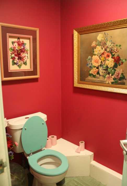 На фото слева интерьер туалета с отделкой виниловыми обоями шелкография в розовом цвете.