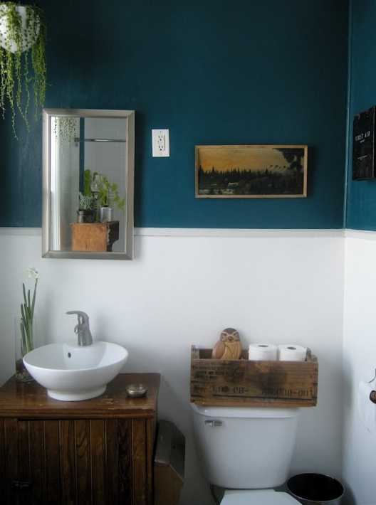 Комбинация с окрашиванием не просто красива, но еще и удобна. Стена покрытая краской будет более защищена от воздействия влаги и появления грибка, а так же простат в уходе. Таким образом, сочетание лучше выполнять по горизонтальному методу, нижнюю часть туалета краской, верхнюю обоями. Место разделения материалов можно оформить настенными молдингами.