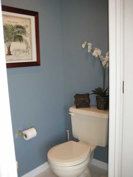 Краску для интерьера небольшого туалета стоит выбирать светлых оттенков (белый, серый, песочный, румяный, голубой). Краска наносится либо водоэмульсионная, либо вододисперсионная (акриловая и латексная) с противогрибковыми добавками.