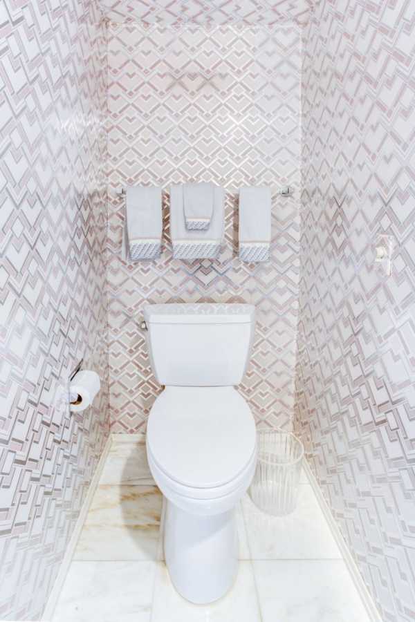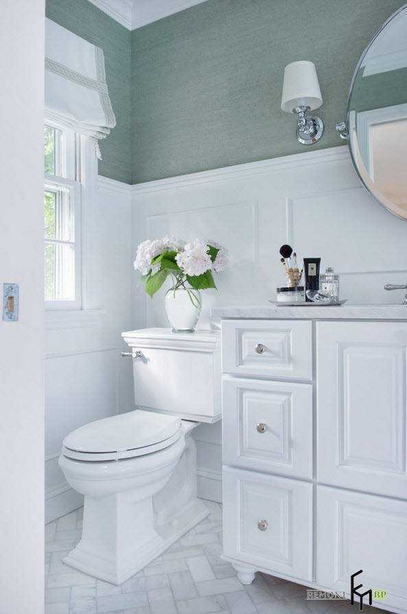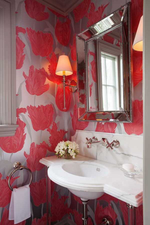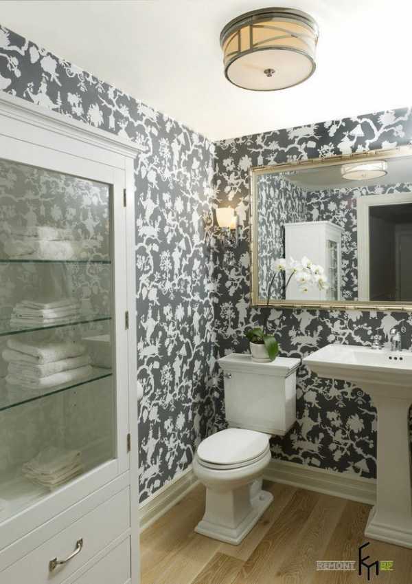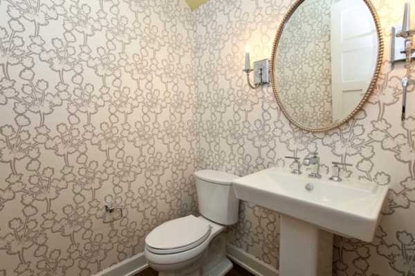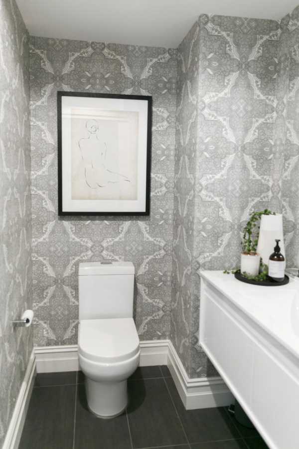 Дизайн может быть цветочным, узорчатым или геометрическим. Также можно оклеить обоями разных цветов, например, зелеными и белыми обоями для визуального увеличения интерьера маленького туалета.