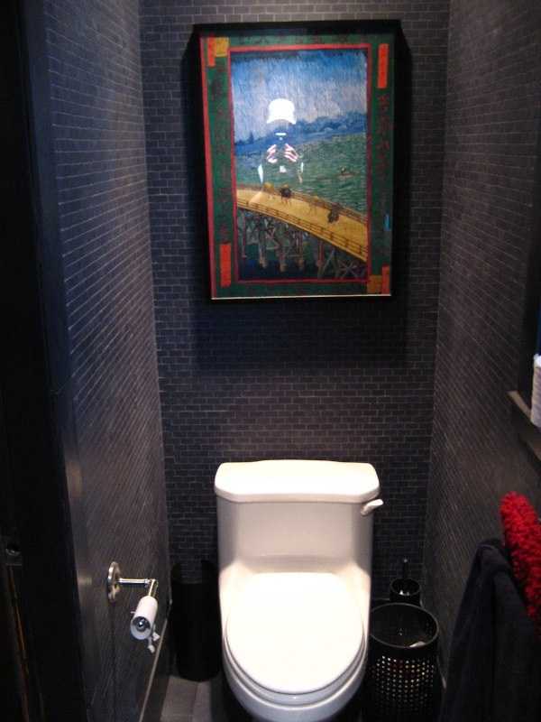 На фото слева компактная туалетная комната отделанная фотообоями расширяющими пространство за счет перспективного изображения.
