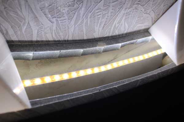 Освещение должно быть основным и локальным. Для основного освещения подойдут встроенные в потолок лампы с плафоном из матового стекла или маленькие точечные светильники. Розетки и выключатели должны быть с противокапельной защитой. Декоративное освещение может быть вдоль потолка, вдоль плинтуса любого цвета.