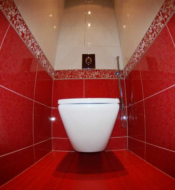 Цвет может быть стандартным белым, черным, красным, синим. Если интерьер маленького санузла тематический или однотонный, то акцент можно сделать не на стене, а на цвете унитаза. Например, красный унитаз подойдет под красный, белый, черный интерьер туалета.