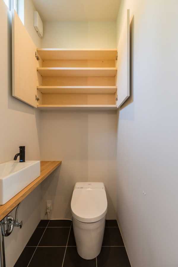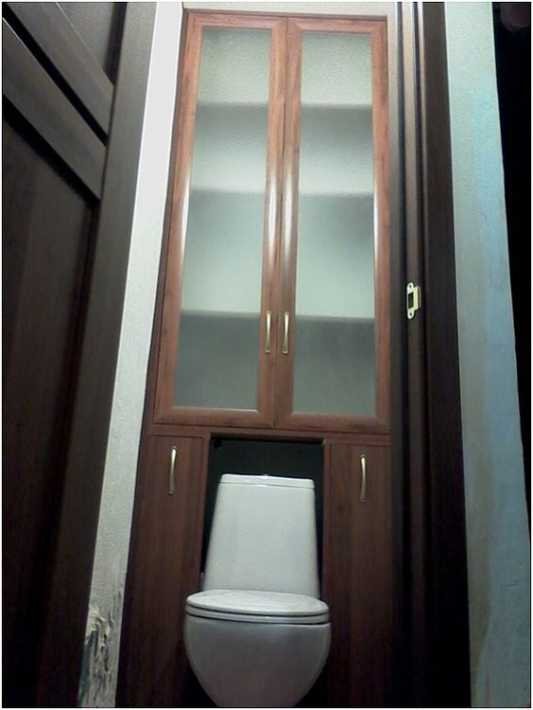 На фото отделка стен и пола плиткой большого размера, шкаф встроен в стену и не выступает над унитазом для экономии пространства.
