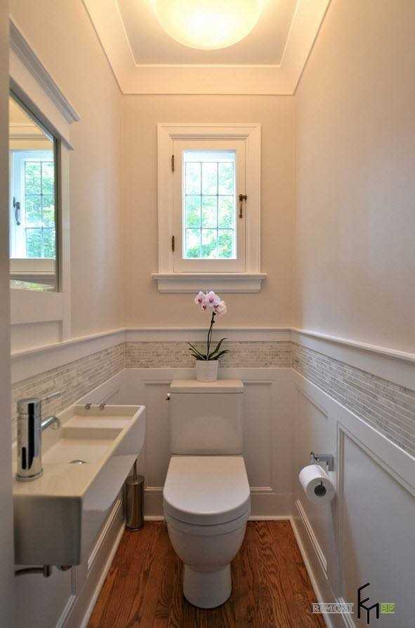 Комбинация двух отделочных материалов часто встречается в интерьерах маленького туалета без ванны. Часто встречаемые комбинации: