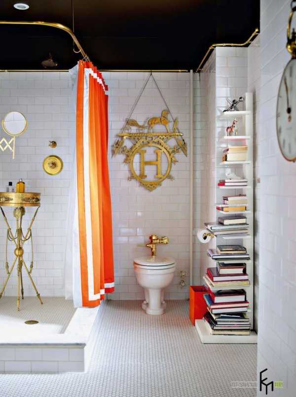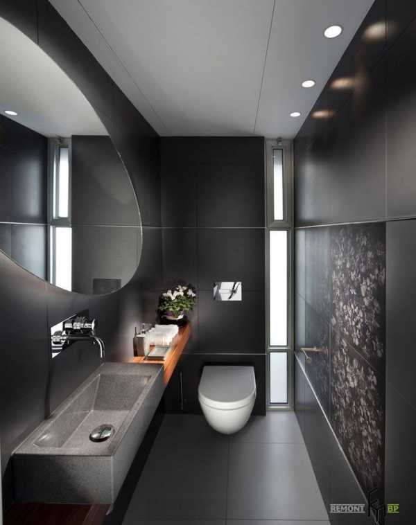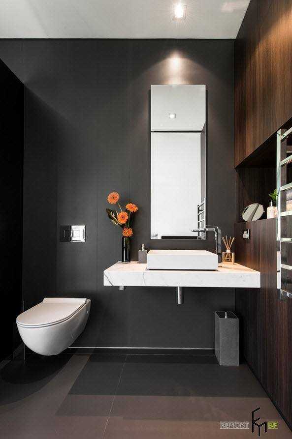 Черный интерьер сочетается с белой сантехникой. Комбинируется с серым, алым, янтарным цветом.