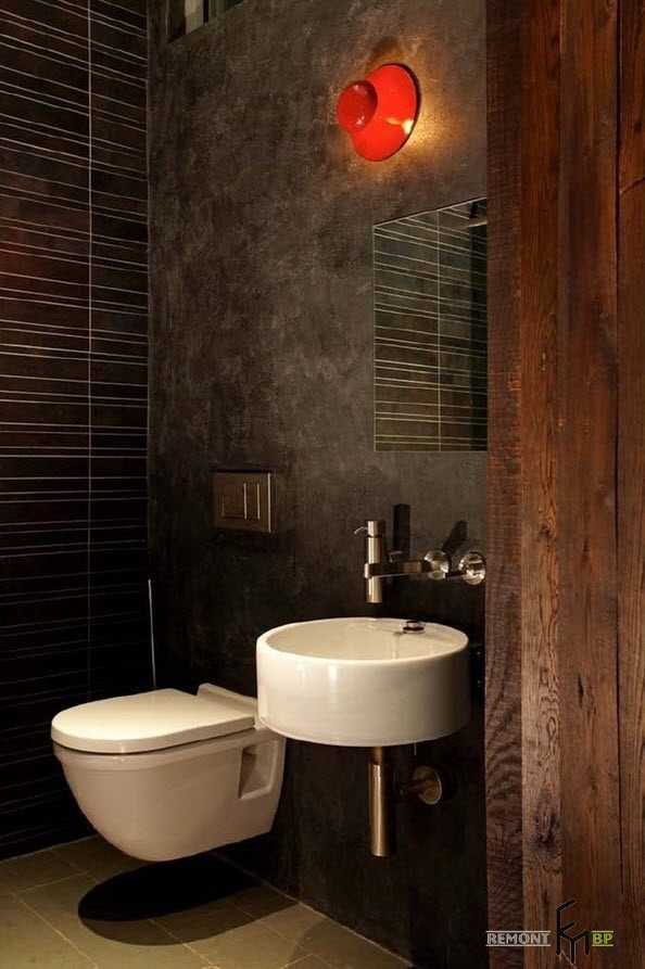 Туалет в стиле лофт чаще всего однотонный белый или серый, иногда с кирпичной кладкой, простыми маленькими светильниками, матовым полом.