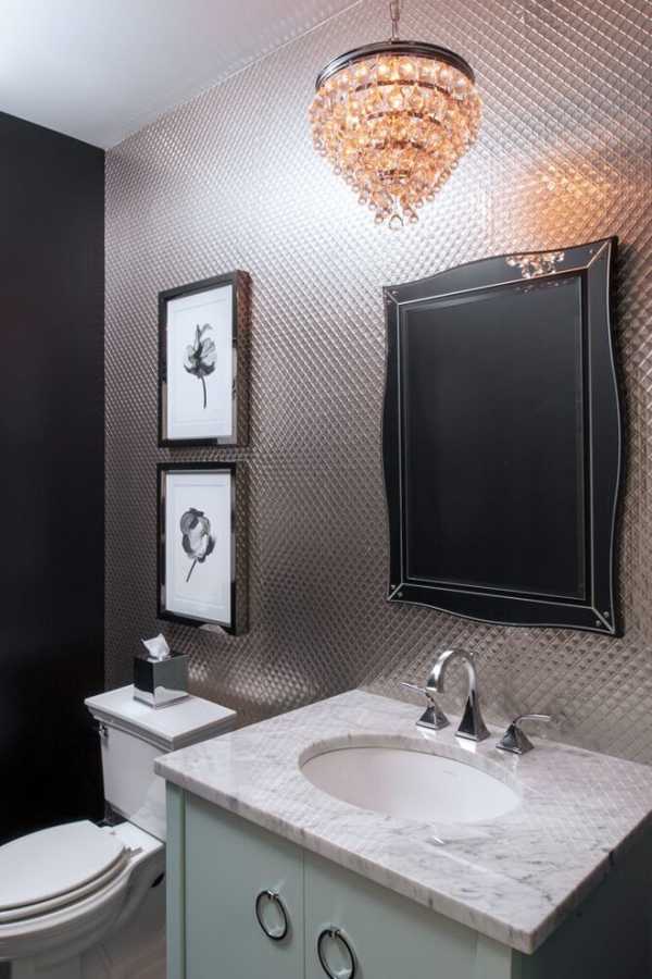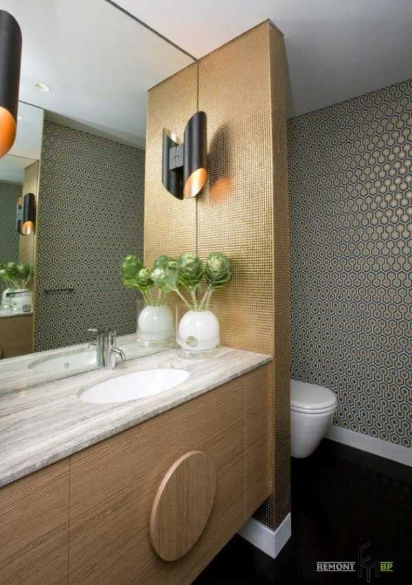 На фото слева туалет с отделкой золотистыми обоями шелкография. Высокое зеркало увеличивает пространство за счет отражающих свойств.