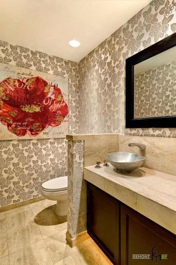 Комбинирование с плиткой будет удобно в туалете с раковиной. Она защитить места наиболее частого контакта с водой и другими предметами. Сочетание может быть выполнено в разных вариациях, например, горизонтальным способом, отделав нижнюю половину туалетной комнаты плиткой, а верхнюю часть обоями или же оформив кафелем одну область, а обоями все остальное пространство.
