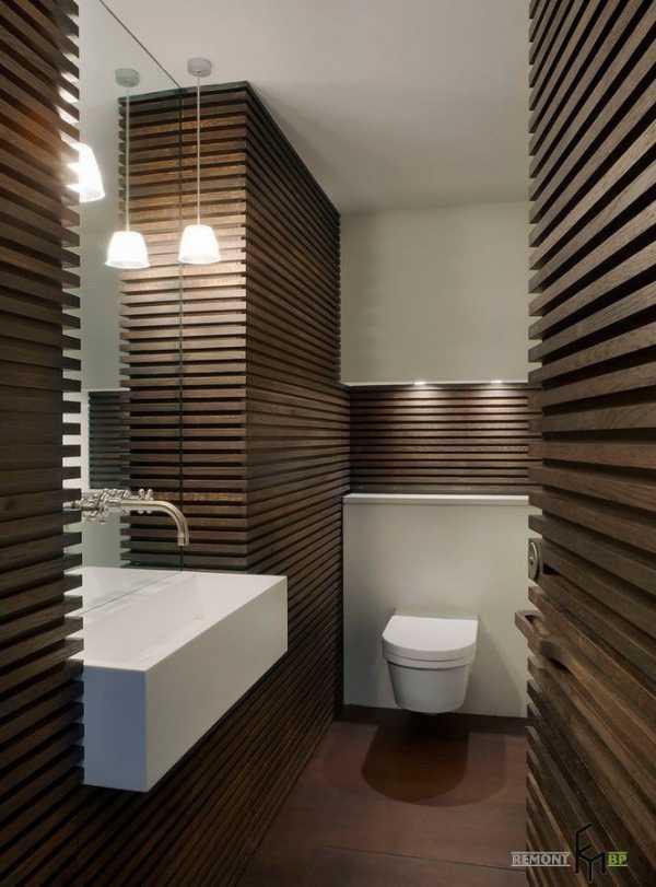 Ламинат можно крепить на клей прямо к стене, тогда пространства будет скрадываться не больше, чем от укладки плитки. Ламинатом можно отделать одну стену, часть или полностью сделать деревянный интерьер маленького туалета, но тогда нужно подбирать разные цвета дерева для пола и стен.