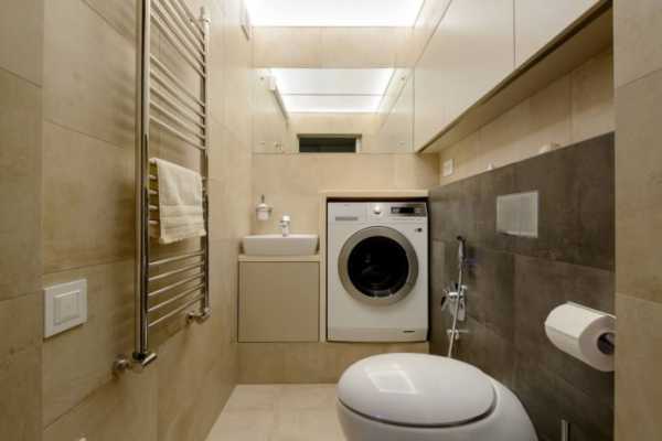 Помимо сантехники лучше отказаться от размещения в компактном туалете стиральной машинки и шкафов. Можно ограничиться настенным шкафчиком или полкой, нишей для хранения бумаги и чистящих средств.